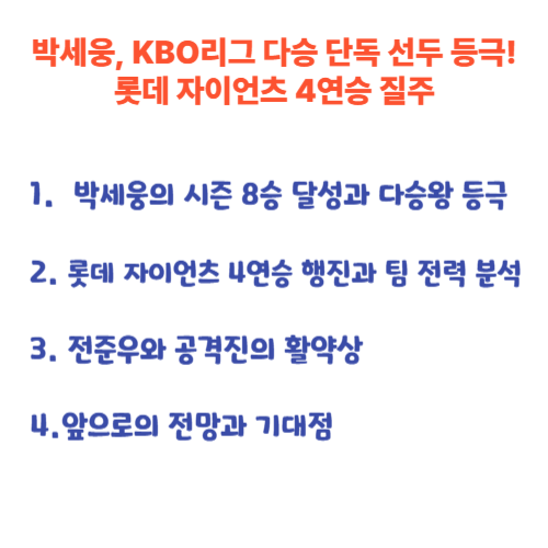 들어가기 📝롯데 자이언츠의 에이스 박세웅이 2025 시즌 8승을 기록하며 KBO리그 다승 단독 1위에 올랐습니다. 수원에서 열린 KT 위즈와의 더블헤더 경기에서 6.1이닝 1실점의 호투를 펼치며 팀의 4연승을 이끌었습니다. 전준우의 활약과 함께 롯데는 시리즈 승리를 확정지었습니다.📋 목차박세웅의 시즌 8승 달성과 다승왕 등극롯데 자이언츠 4연승 행진과 팀 전력 분석전준우와 공격진의 활약상앞으로의 전망과 기대점🎯 박세웅, 시즌 8승으로 다승 단독 선두 달성완벽한 투구 내용으로 증명한 에이스의 가치 ⚡박세웅은 수원KT위즈파크에서 열린 2025 신한 SOL Bank KBO 리그 더블헤더 1경기에서 뛰어난 투구를 선보였습니다. 6.1이닝 동안 단 1실점(무자책점)만 허용하며 시즌 8승째를 기록했습니다.이번..