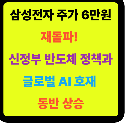 📝 들어가기2025년 6월 9일, 삼성전자 주가가 2개월여 만에 6만원선을 돌파하며 강력한 상승세를 보이고 있습니다. 전 거래일 대비 2.03% 오른 6만300원에 거래되며 7거래일 연속 상승 가능성을 보여주고 있습니다. 이재명 대통령의 반도체 육성 정책 기대감과 엔비디아를 비롯한 글로벌 AI 반도체 시장의 호조가 주요 동력으로 작용하고 있어 주목됩니다. 🚀📋 목차🎯 삼성전자 주가 급등 현황 분석🏛️ 신정부 반도체 정책의 긍정적 영향🌐 글로벌 AI 반도체 시장 호재 요인💡 기술 경쟁력 회복에 대한 기대감📊 향후 전망과 투자 포인트🎯 삼성전자 주가 급등 현황 분석삼성전자 주가가 드디어 6만원 벽을 넘어섰습니다! 💪 2025년 6월 9일 한국거래소 기준으로 오전 10시 58분 현재 삼성전자..