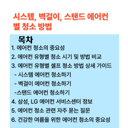 여름철 무더위를 이겨내기 위한 필수 가전인 에어컨! 하지만 제대로 관리하지 않으면 냉방 효율이 떨어지고 각종 냄새와 세균이 번식할 수 있습니다. 에어컨 청소는 시기적절하게 해주어야 건강하고 시원한 여름을 보낼 수 있습니다. 이 가이드에서는 시스템 에어컨, 벽걸이 에어컨, 스탠드 에어컨별 청소 시기와 방법을 알아보고, 삼성과 LG 서비스센터 정보까지 종합적으로 안내해 드립니다.목차에어컨 청소의 중요성에어컨 유형별 청소 시기 및 방법 비교에어컨 유형별 셀프 청소 방법 상세 가이드시스템 에어컨 청소하기벽걸이 에어컨 청소하기스탠드 에어컨 청소하기삼성, LG 에어컨 서비스센터 정보에어컨 청소 관련 자주 묻는 질문결론: 건강한 여름을 위한 에어컨 청소의 중요성1. 에어컨 청소의 중요성에어컨 청소는 단순히 외관 관리..